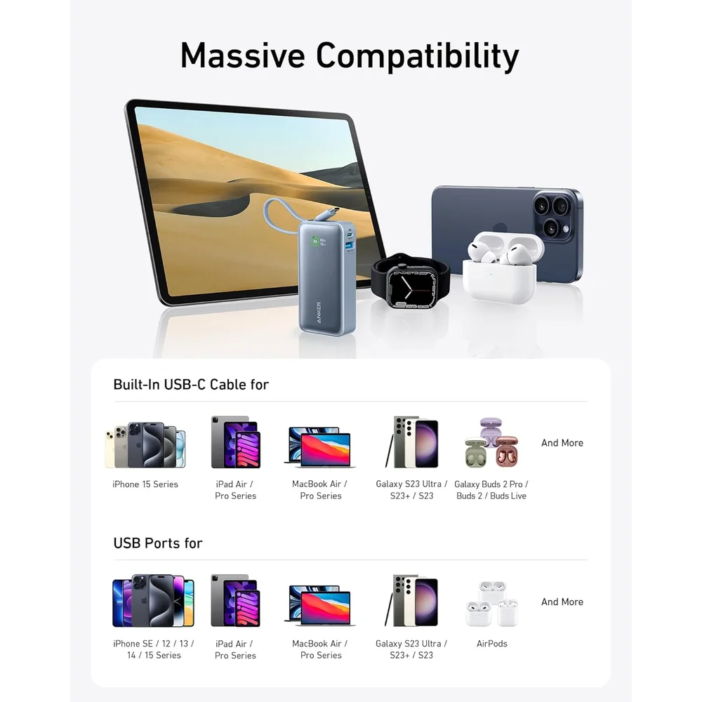 Whether you’re commuting to work, traveling internationally, attending outdoor events, managing remote work across multiple devices, or simply extending your device’s battery life during busy days, the Anker Nano Power Bank delivers dependable, cable-free charging with Anker’s legendary reliability. Its built-in USB-C cable (vs. traditional cable-dependent power banks) provides true plug-and-charge convenience, while the 30W fast charging and dual USB-C/USB-A ports prove that compact portable chargers shouldn’t compromise on versatility or speed—making every moment more connected, productive, and perfectly powered with the peace of mind that comes from trusted brand quality and intelligent power management.