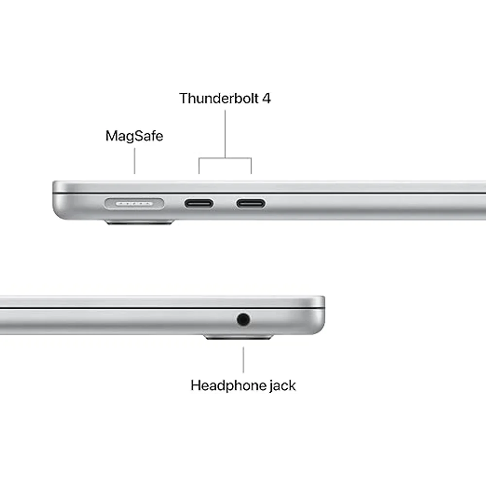 - Ports: 2× Thunderbolt / USB 4 (charging, DisplayPort, Thunderbolt 40Gbps), 3.5mm headphone jack, MagSafe charging port