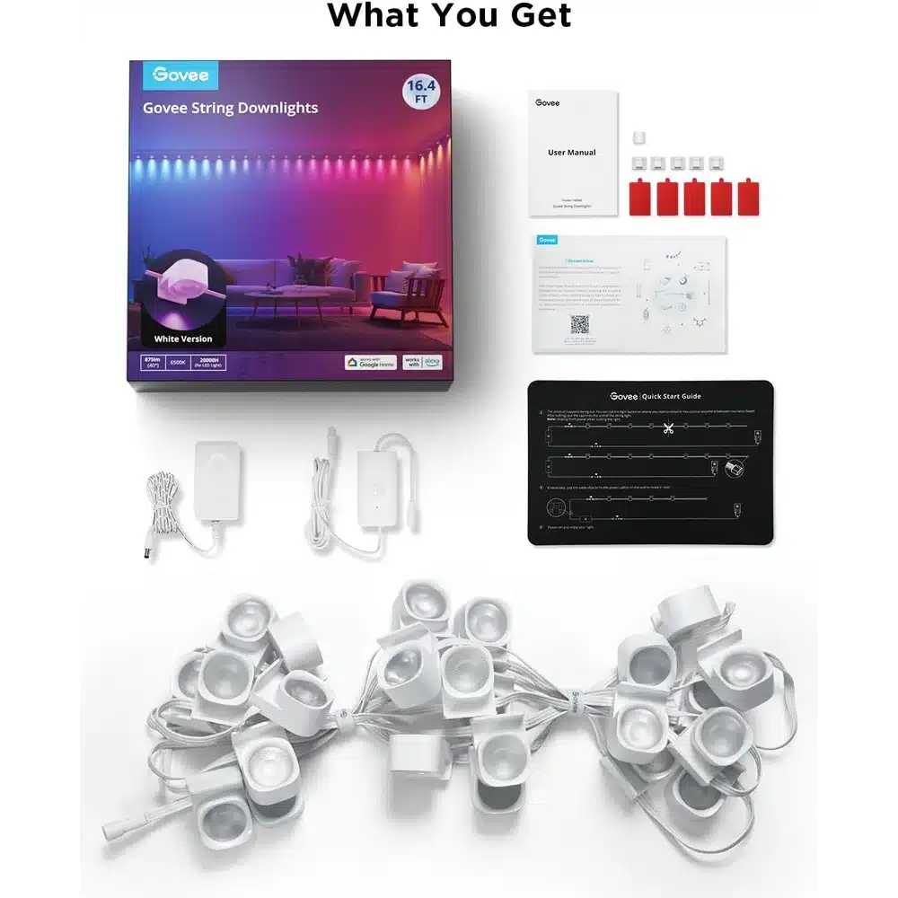 - Included: 16.4ft RGBIC string downlights (25 LEDs), 12V power adapter, mounting clips, adhesive pads, controller, user manual