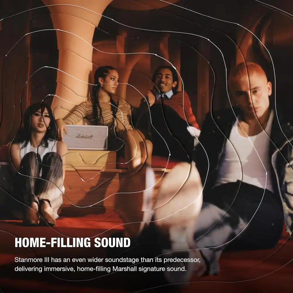 50W RMS with 5.25″ woofer + dual 1″ tweeters for deep 45Hz bass (20% deeper than Stanmore II).