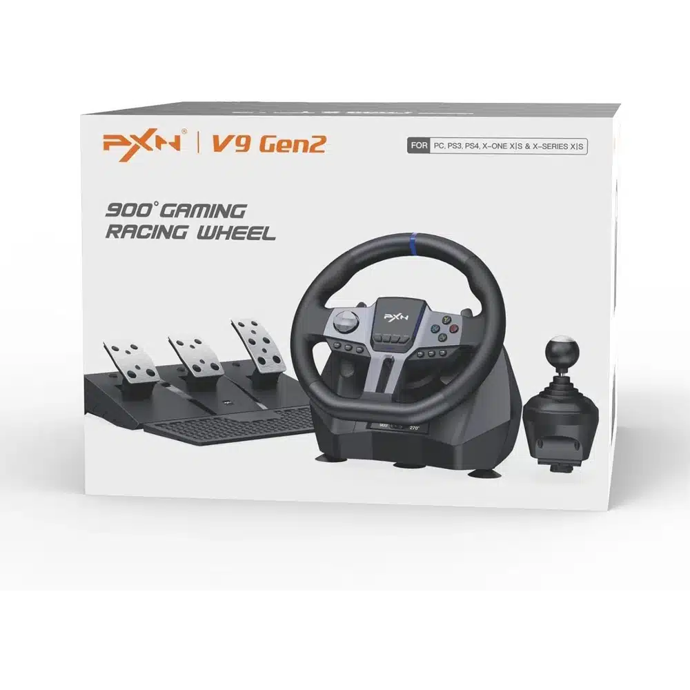 PXN V9 Gen2 Gaming Steering Wheel elevates your racing experience with exceptional precision, realistic control, and wide compatibility across multiple gaming platforms. Designed for serious racing fans and casual gamers alike, this advanced racing wheel delivers immersive gameplay with intuitive handling, strong force feedback simulation, and a full set of pedals and shifter for an authentic driving environment.